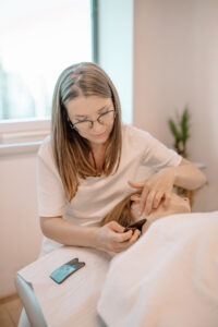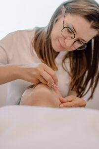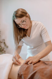 Podczas zabiegu korzystam ze sterylnych, jednorazowych igieł, które delikatnie wprowadzam w skórę. Zazwyczaj używam kilku igieł podczas jednej sesji i pozostają one w ciele przez około 20–30 minut. Po zabiegu warto zadbać o odpowiednie nawodnienie organizmu. Terminy kolejnych sesji ustalamy indywidualnie, najczęściej odbywają się one w tygodniowych odstępach.